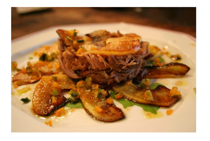 Désosser la selle afin de récupérer les filets auxquels vous retirerez la peau et les nerfs afin de ne conserver que le muscle. Mettre les filets sur le dos pour les ouvrir en portefeuille. Tapisser l'intérieur des filets de la purée que vous avez préparée, repliez la viande, assaisonner et faire cuire à la poêle avec un peu d'huile d'olive, 3 mn de chaque coté. Couper en tranches fines et dresser à l'assiette.CARPACCIO
